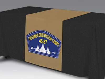 Digital dye-sublimated fabric table runner on 9oz wrinkle-resistant polyester. Machine washable with scratch-resistant graphics. Versatile design drapes the front, top, and back of any standard table. Cost-effective option to team with any solid-color table cover for professional branding.