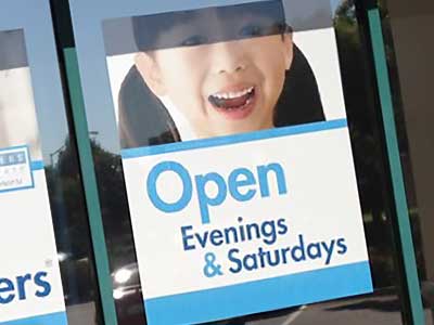 Window graphics designed to be installed on the inside of retail windows and viewed from the outside. Custom printed white vinyl with face adhesive for reverse application. Easy peel & stick format with clean, residue-free removal. Perfect for retail showrooms, bookstores, professional offices, and display cases.